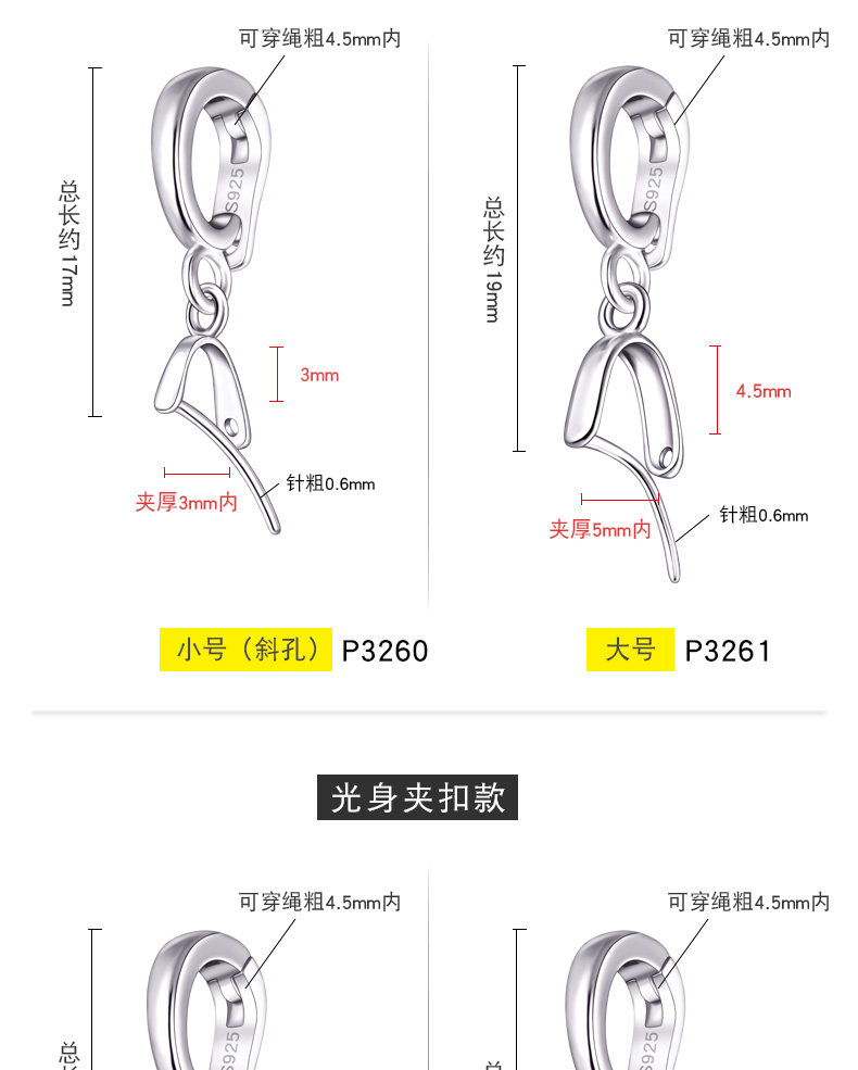 925银大光身夹扣,规格:3.3x10m…