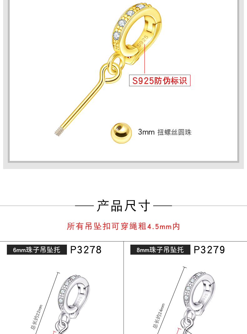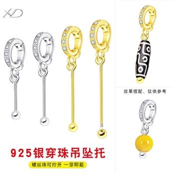 S925银串珠扣头镀18k手工DIY圆珠珍珠圆珠吊坠空托螺纹项链坠子