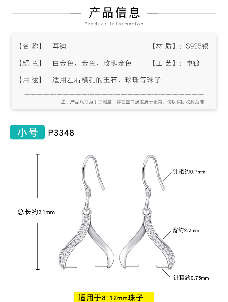 925银三粒石耳钩镀白金,规格.:…